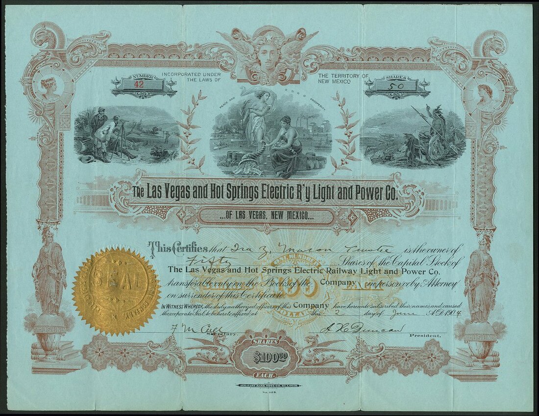 (x) U.S.A.: Las Vegas and Hot Springs Electric R'y Light and Power Co., New Mexico, $100 shares, 190[4], #42, 3 attractive vignettes of surveyors, allegorical figures and native Americans watching steam train, brown and black on blue paper, gold seal, Aug. Gast Bank Note Co. VF.