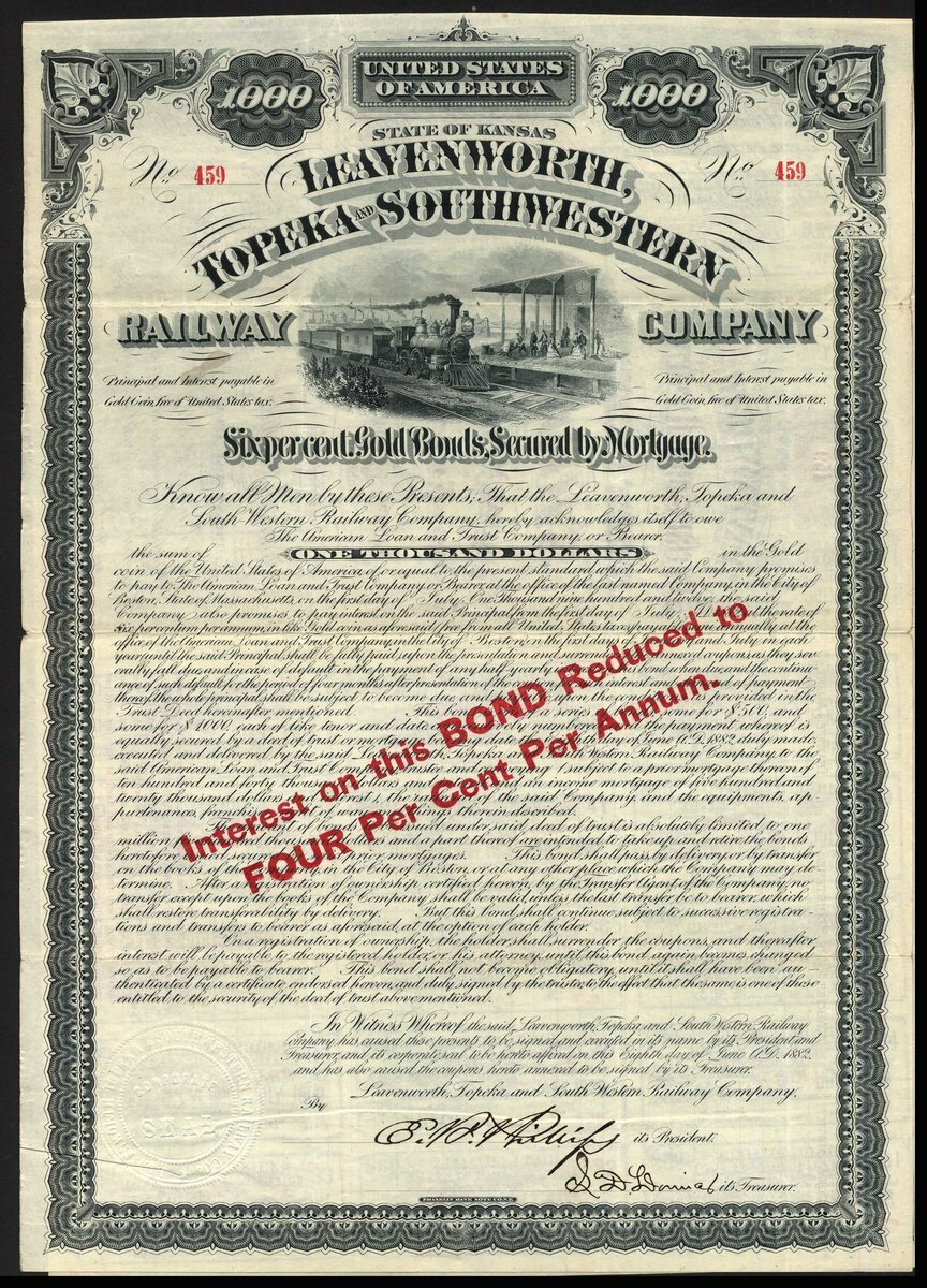 U.S.A.: Leavenworth, Topeka and Southwestern Railway Co. (KS), 6% first mortgage gold bond for $1000, 1882, #459, train arriving at station at top, ornate border, with coupons, overprinted on face with reduction to interest rate. AVF.