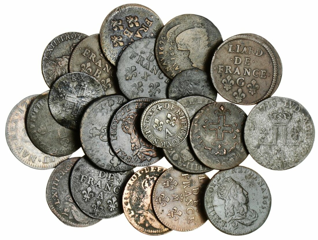 France, Kingdom {Bourbon}, Louis XIV, 'le roi soleil' (1643-1715), 30-Deniers aux deux-L couronnés, Lyon [2], 1710-D; 1711-D (Gad 102; Droulers 692); 16-Deniers, Strasbourg [2], 1710-BB; another, 1711, an imitation (Droulers 699); 15-Deniers aux deux-L couronnés, 1712-AA, Metz (Droulers 698); 6-Deniers, "Dardennes" type [2], 1711-S; 1712-S (Droulers 704), Liards [12], 165[?]-C, Corbeuil [2], 1655-A; 1656-A; Pont de l'Arche [2], 1655-B, 1656-B; 1655-G, Montreuil-Bonnin; 1655-R, Nimes; Meung-sur-Loire [2]; 1657-E; 1658-E; 1693-M, Toulouse; Amiens [2], 1695-X; 1696-X, heavily double-struck (Droulers 708-709); lastly, Denier-Tournois, 1649-A (Droulers 713), some with light corrosion, otherwise fine to very fine, some scarcer types [21]