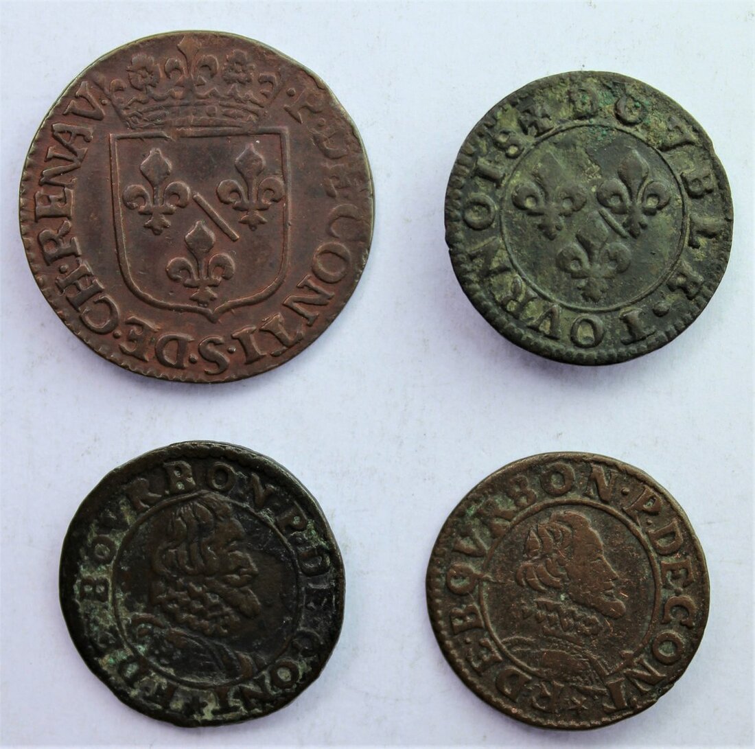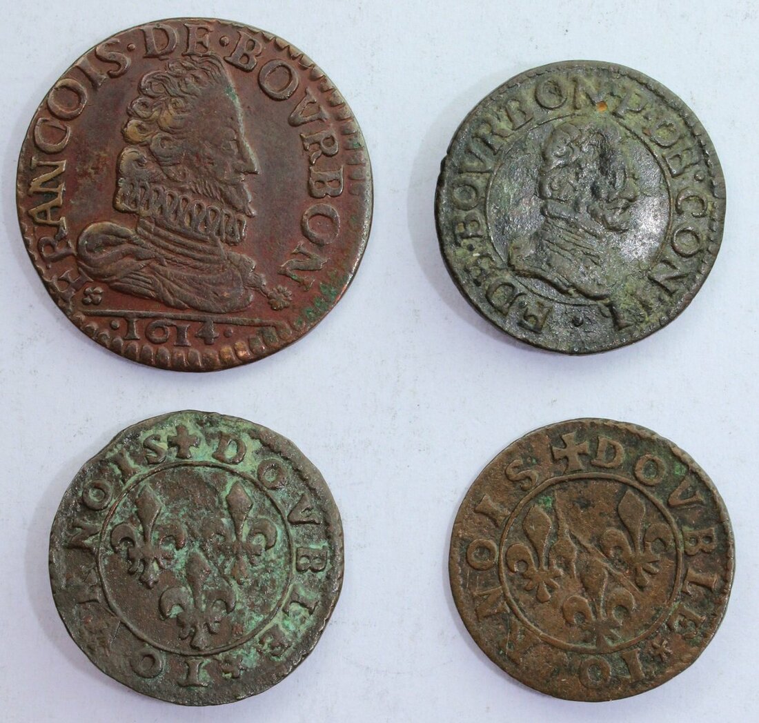 France, Feudal, Principality of Chateau-Regnault, Francois de Bourbon-Conti (1605-14) [4], Liard, 1614 (cf. Poey d'Avant 6203; cf. Boudeau, 1819), lightly wiped, otherwise very fine for strike, rare thus; additionally, Double-Tournois, undated [3] (cf. Boudeau 1823; cf. Poey d'Avant 6210), fine or better [4]