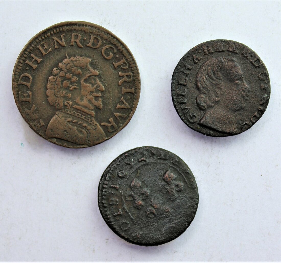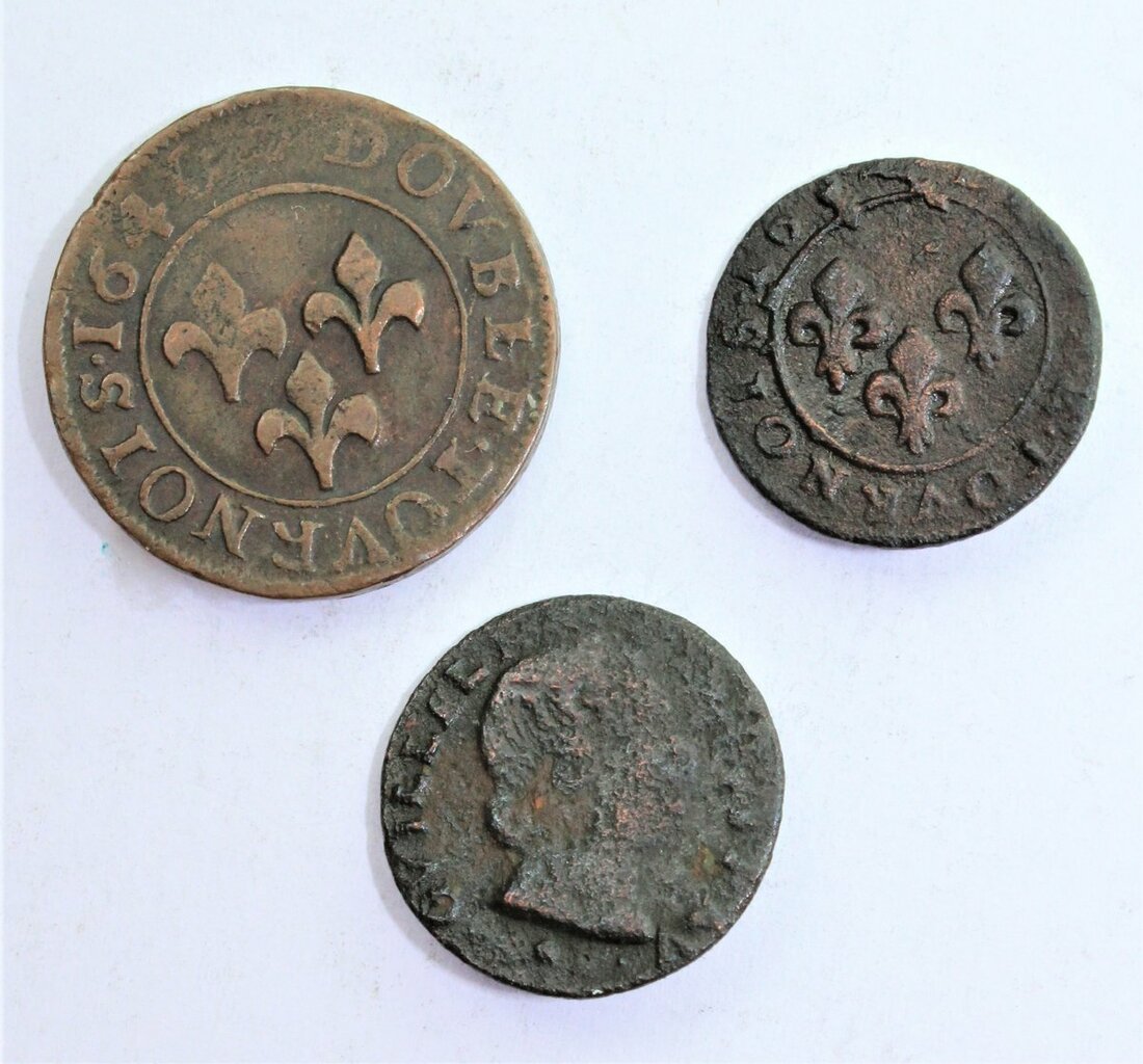 France, Feudal, Principality of Orange, Frederick Henry of Nassau (1625-47), AE Double-Tournois, 1640 (Boudeau 1006; Poey d'Avant 4608); also, Denier-Tournois, 1652 [2] (CGKL 790), fine or near so but rough surfaces [3]
