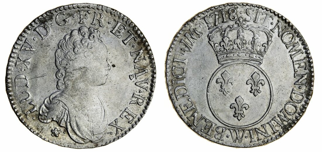 France, Kingdom {Bourbon}, Louis XV, 'le Bien-Aimé' (1715-74), Écu, 'Vertugadin' type, 1718-W, Lille (Duplessy 1651A; Dav. 1326; Gad 317; KM 414.1; undertype Écu aux 'trois couronnés', cf. Droulers 450), harshly cleaned, undertype {1710-D, Lyon}, visible in parts, otherwise almost very fine, rare