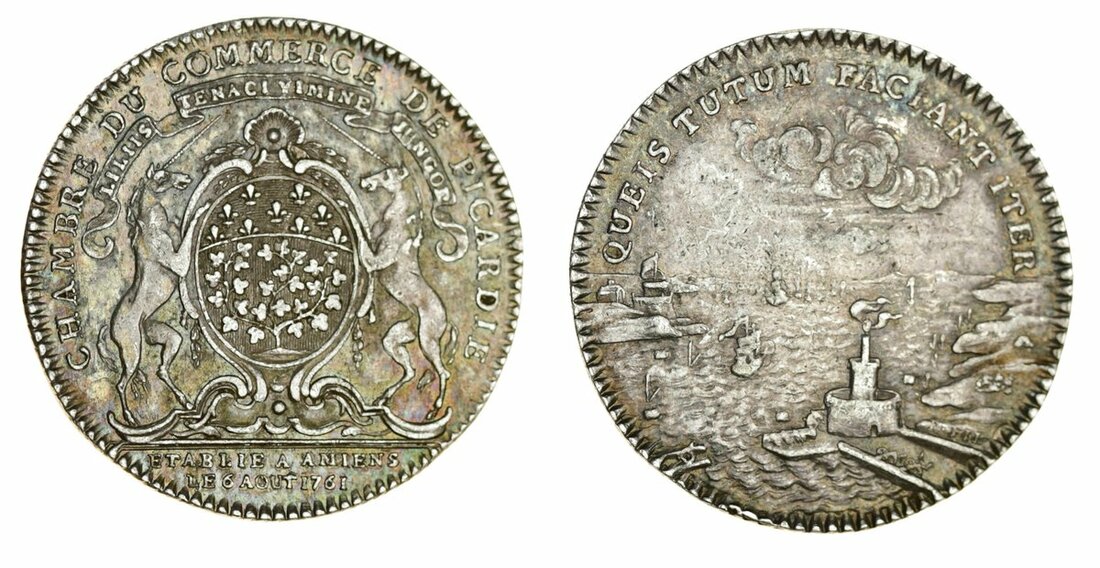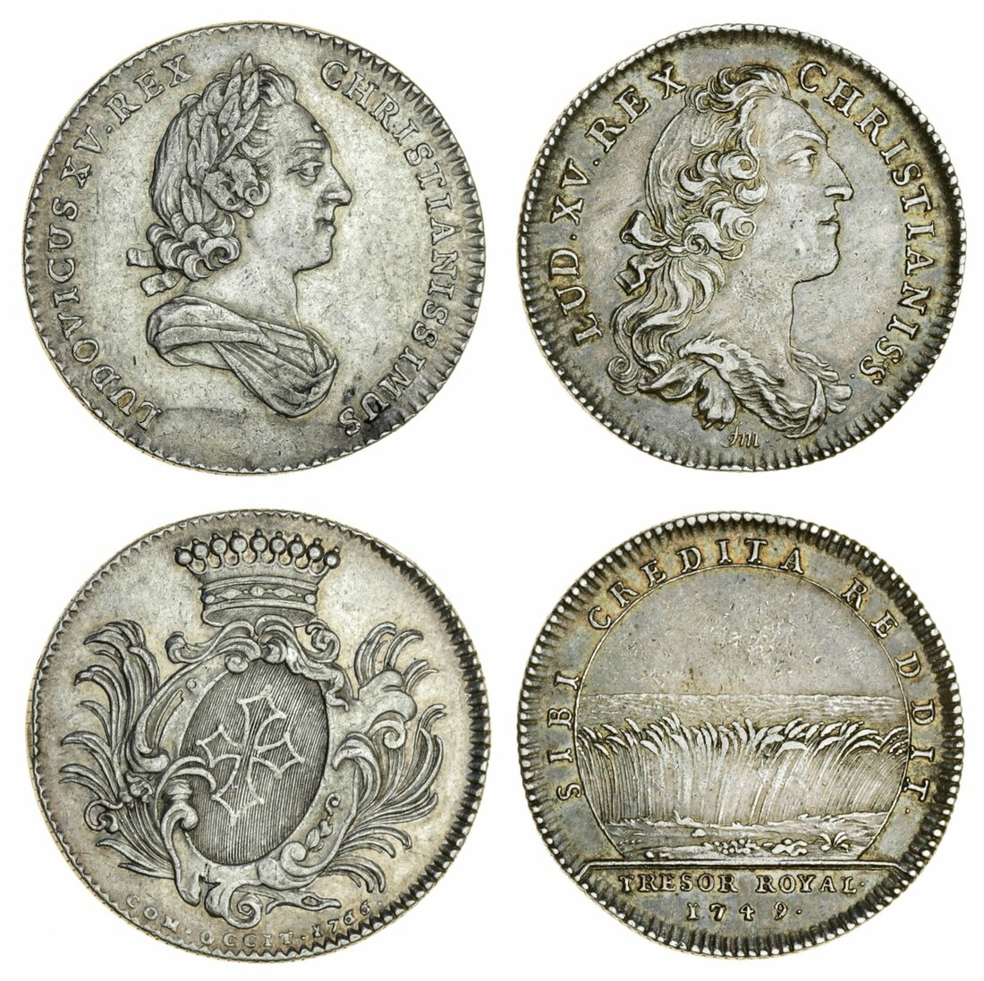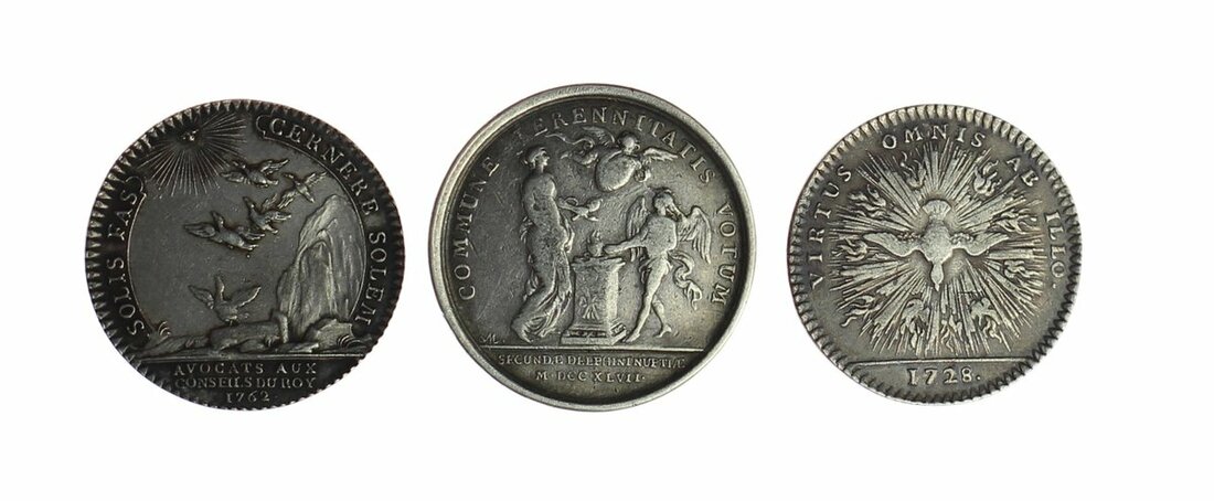France, Kingdom {Bourbon}, Louis XV, 'le Bien-Aimé' (1715-74), AR Jettons and Medals [7], including, Order of the Holy Spirit, 1728, 28mm., edge plain (Feuardent 1622); Second Marriage of the Dauphin, 1747, COMMUNE PERENNITATIS VOTUM, 31mm., edge plain (Czapski 2779); Royal Treasure, 1749, 28.5mm., edge milled (Feuardent 2075); Rouen, 29.5mm., edge milled, once mounted, sweated surfaces; Chambre du Commerce de Picardie, 1761, 29.5mm., edge milled (Feuardent 6533); toned, good fine; also, Council of Lawyers for the King, 1762, edge milled (cf. F -); Languedoc, 1766, 29.5mm., edge milled, some lightly cleaned, fine to very fine (7)