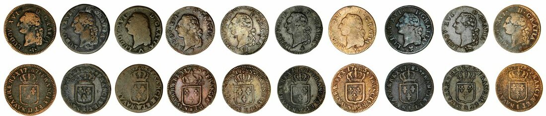France, Kingdom {Bourbon}, Louis XVI (1774-93), Sols à l'écu [10], 1779-I, Limoges; Orléans [2], 1782-R, lustrous, very fine or better; 1784-R; Lille [2], 1782-W; another, 1790-W; 1785-B, Rouen; 1785-BB, Strasbourg; 1785-K, Bordeaux; 1785-L, Bayonne; 1787-D, Lyon (Droulers 816; Duplessy 1714; Gad 350; KM 578), fair to good fine, some once cleaned, others scarcer types [10]
