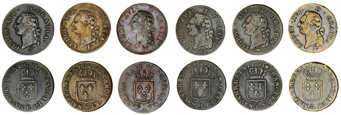 France, Kingdom {Bourbon}, Louis XVI (1774-93), Sols aux écus, 1791 [6], -A [2], Paris, with heron good fine; another, with leopard, lustrous, good very fine, rare; -AA, Metz, lacquered, fine; -B, Rouen, fine; -D, Lyon, fair; lastly, -R, Orleans (Droulers 816; Duplessy 1714; Gad 350; KM 578), fine or better [6]