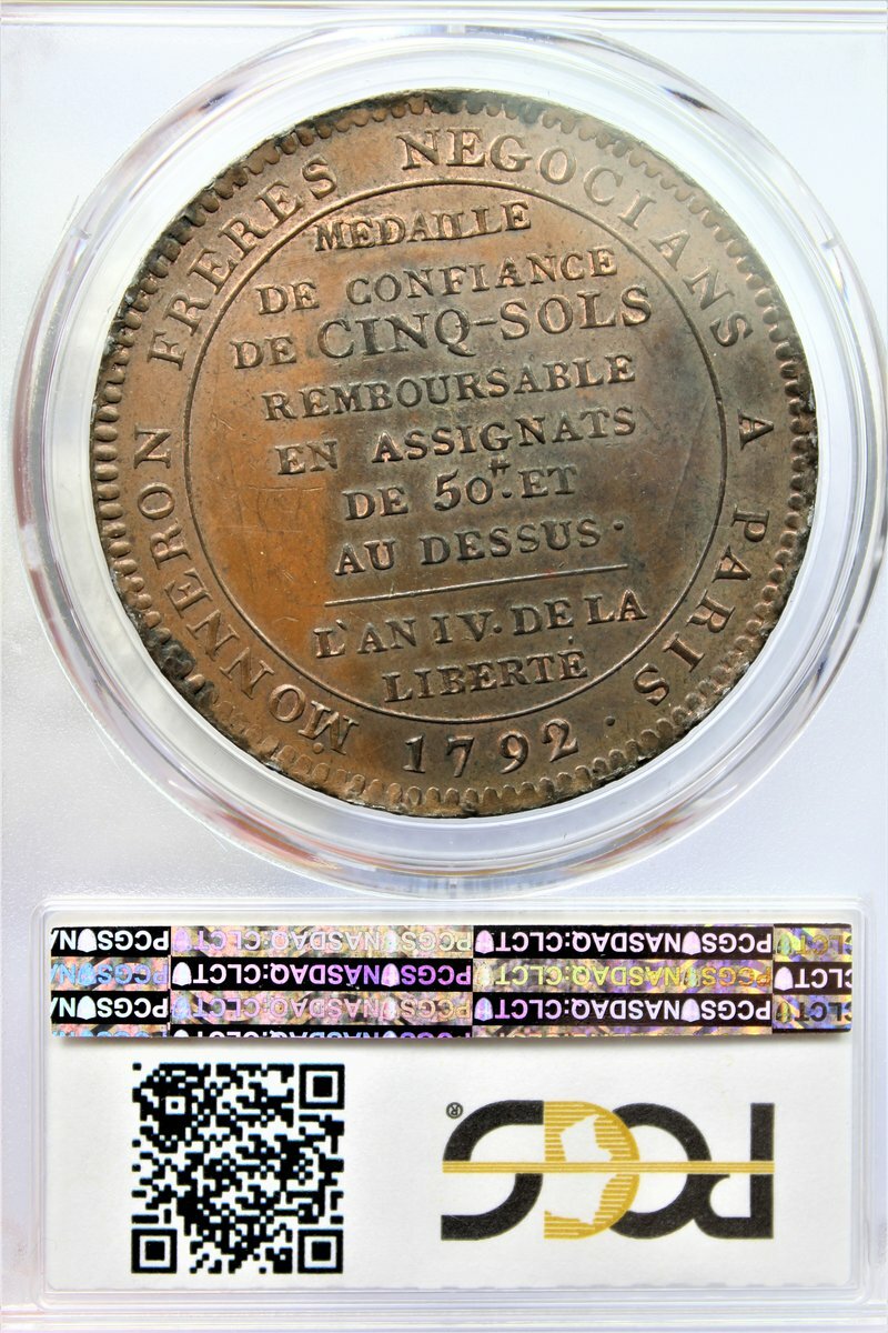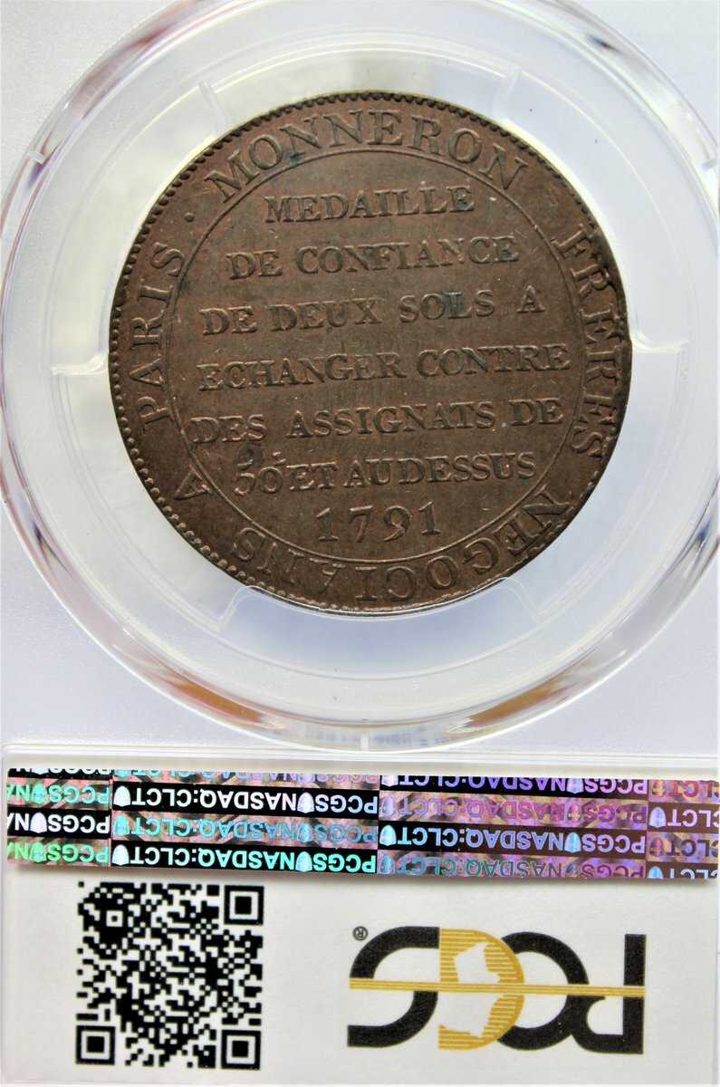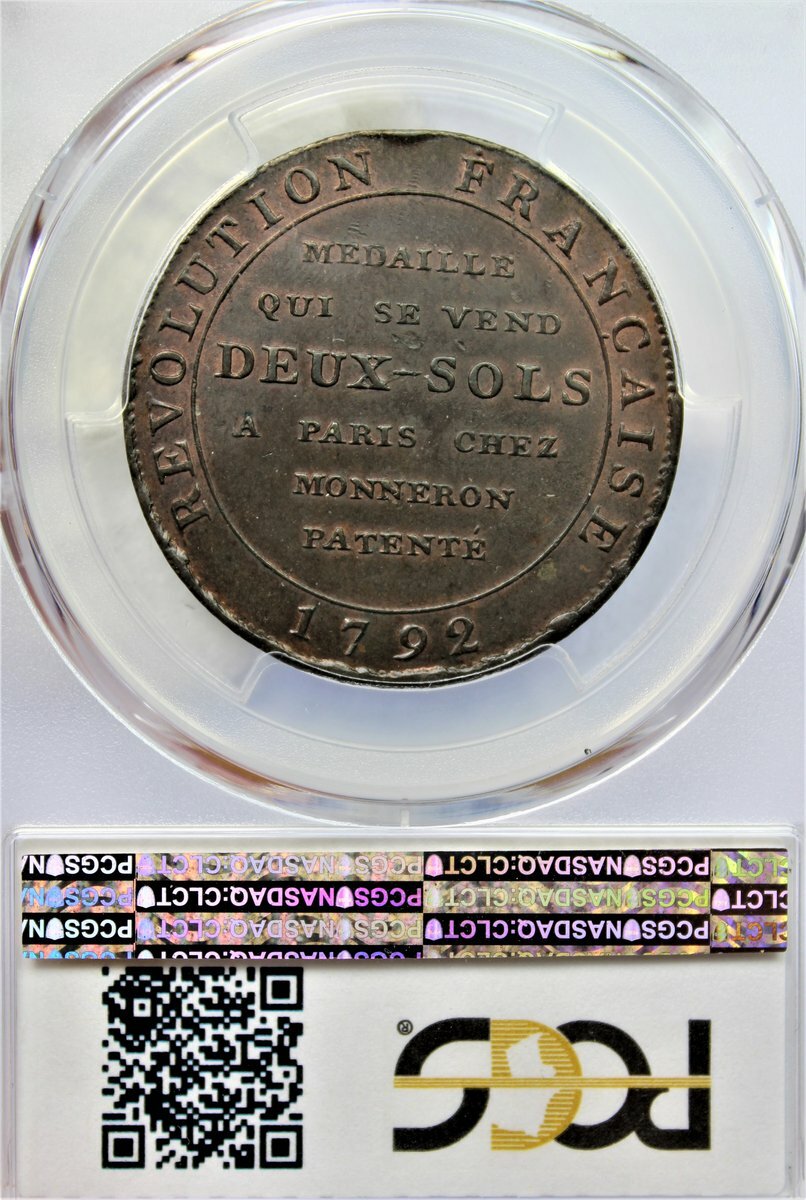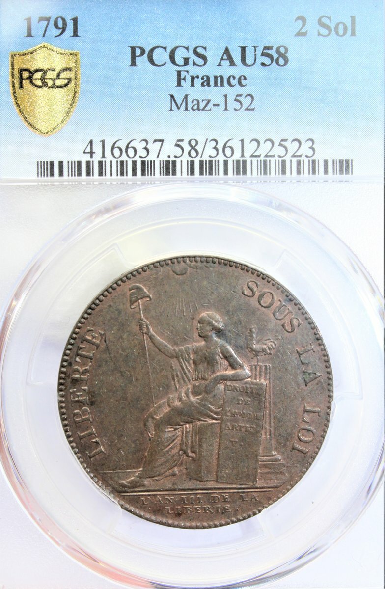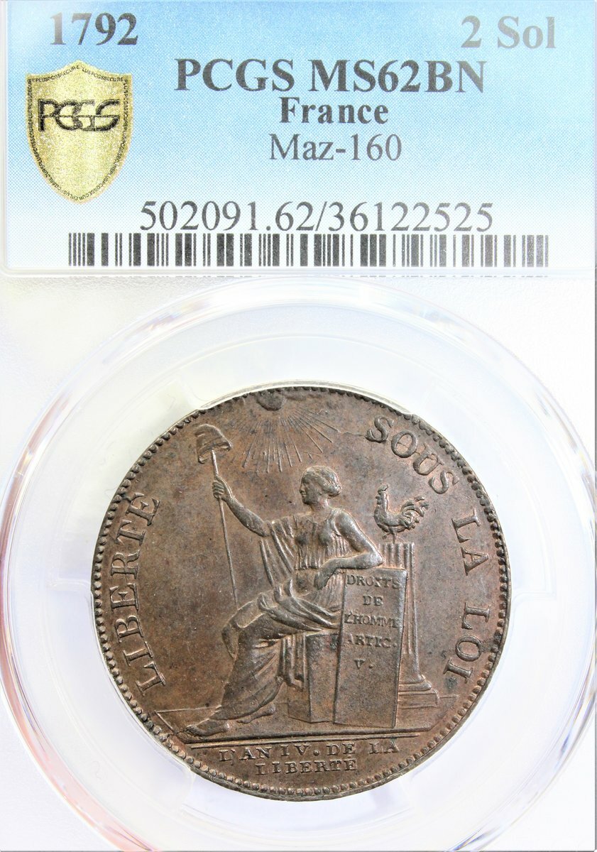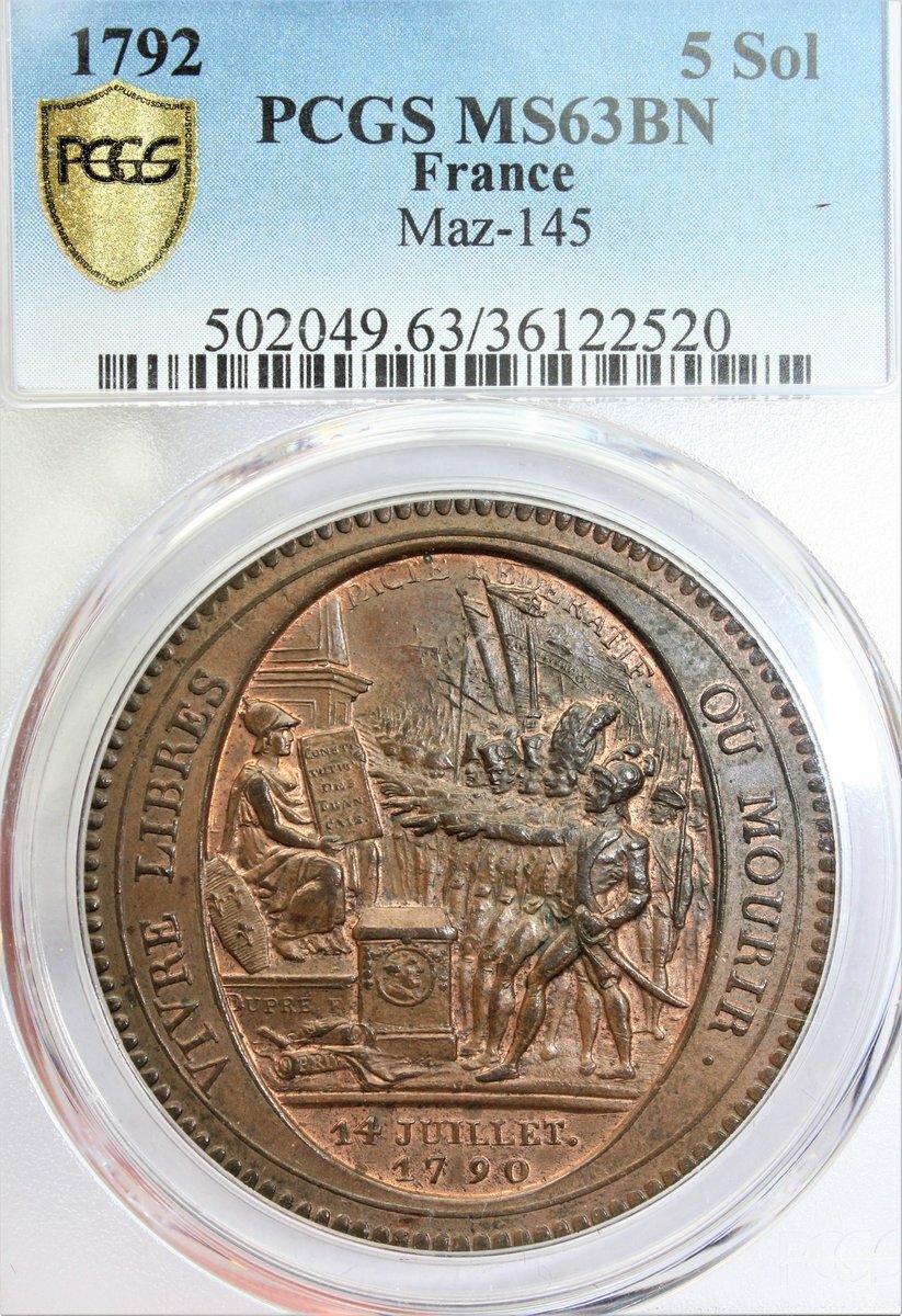 France, First Republic, Convention Nationale (1792-95), Monneron {3}, 5-Sols, 1792 (Maz 145; KM Tm31) ~ MS63BN; 2-Sols [2], 1791 (Maz 152; KM Tn23) ~ AU58; another, 1792 (Maz 160; KM Tn25) ~ MS62BN, all in PCGS holders [3]