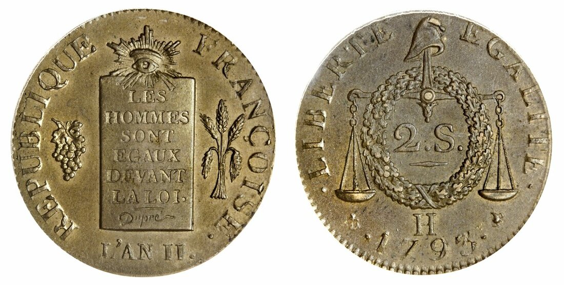 France, First Republic, Convention Nationale (1792-95), 2-Sols aux balances, AN II / 1793-H, La Rochelle, by Augustin Dupré (Gad 31; KM 621.6), a quite exceptional example for type, very rare in this condition, in PCGS holder, graded MS64