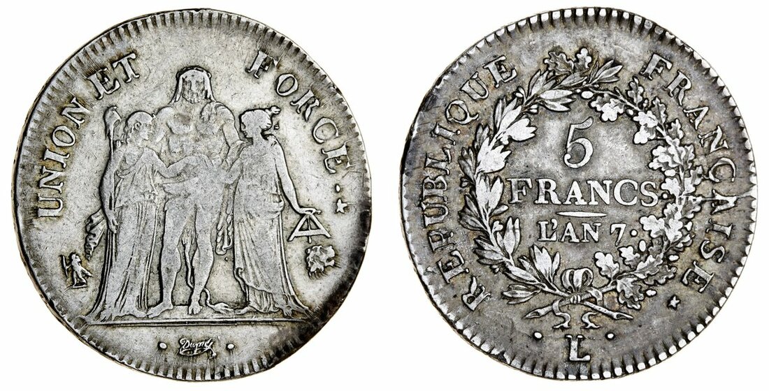 France, First Republic, Directoire (1795-99), 5-Francs, AN 7-L {1798}, Bayonne, "Union et Force" (Le Franc 294.27; Gad 563; KM 639.6), toned, good fine