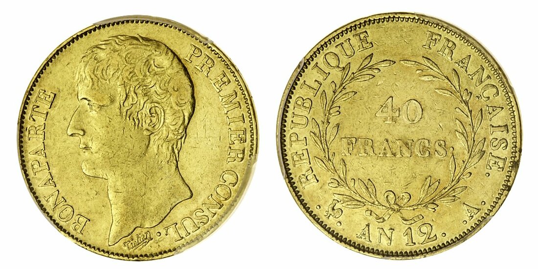 (g) France, First Republic, Consulship, Napoléon Bonaparte (1799-1804), gold 40-Francs, AN 12-A {1803-4}, Paris, bare head (Le Franc 536.4; Fb 479; Gad 1080; Maz 403), in PCGS holder, graded AU50