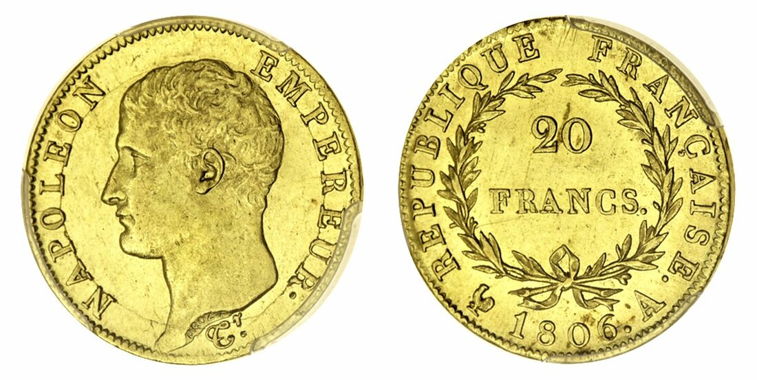 (g) France, First Empire, Napoléon Bonaparte (1804-14), gold 20-Francs, 1806-A, Paris, bare head (Le Franc 513.1; Fb 487; Gad 1023; KM 674.1), an exceptional example, very rare in this grade, in early PCGS holder, graded MS63, the joint second finest