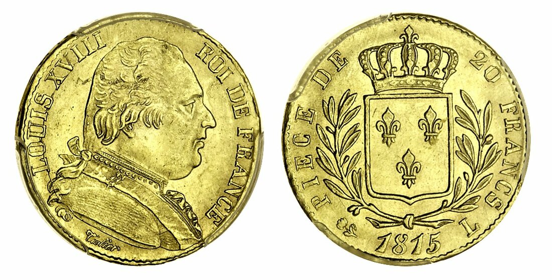 (g) France, Restored Kingdom, Louis XVIII (1814 / 1815-24), gold 20-Francs, 1815-L, Bayonne, uniformed bust (Le Franc 517.14; Fb 526; Gad 1026; KM 706.4), in PCGS holder, graded MS63