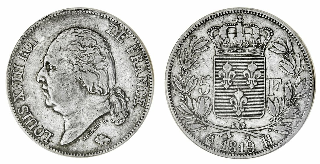 France, Restored Kingdom, Louis XVIII (1814 / 1815-24), 5-Francs, 1819-H, La Rochelle, head left (Le Franc 309; KM 711.5), very rare, in early PCGS holder, graded XF40