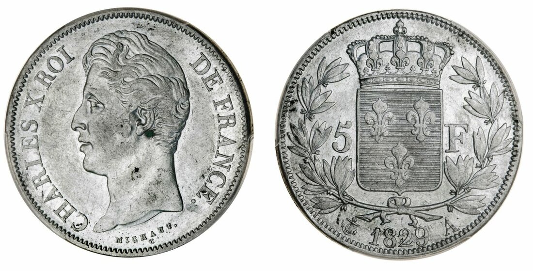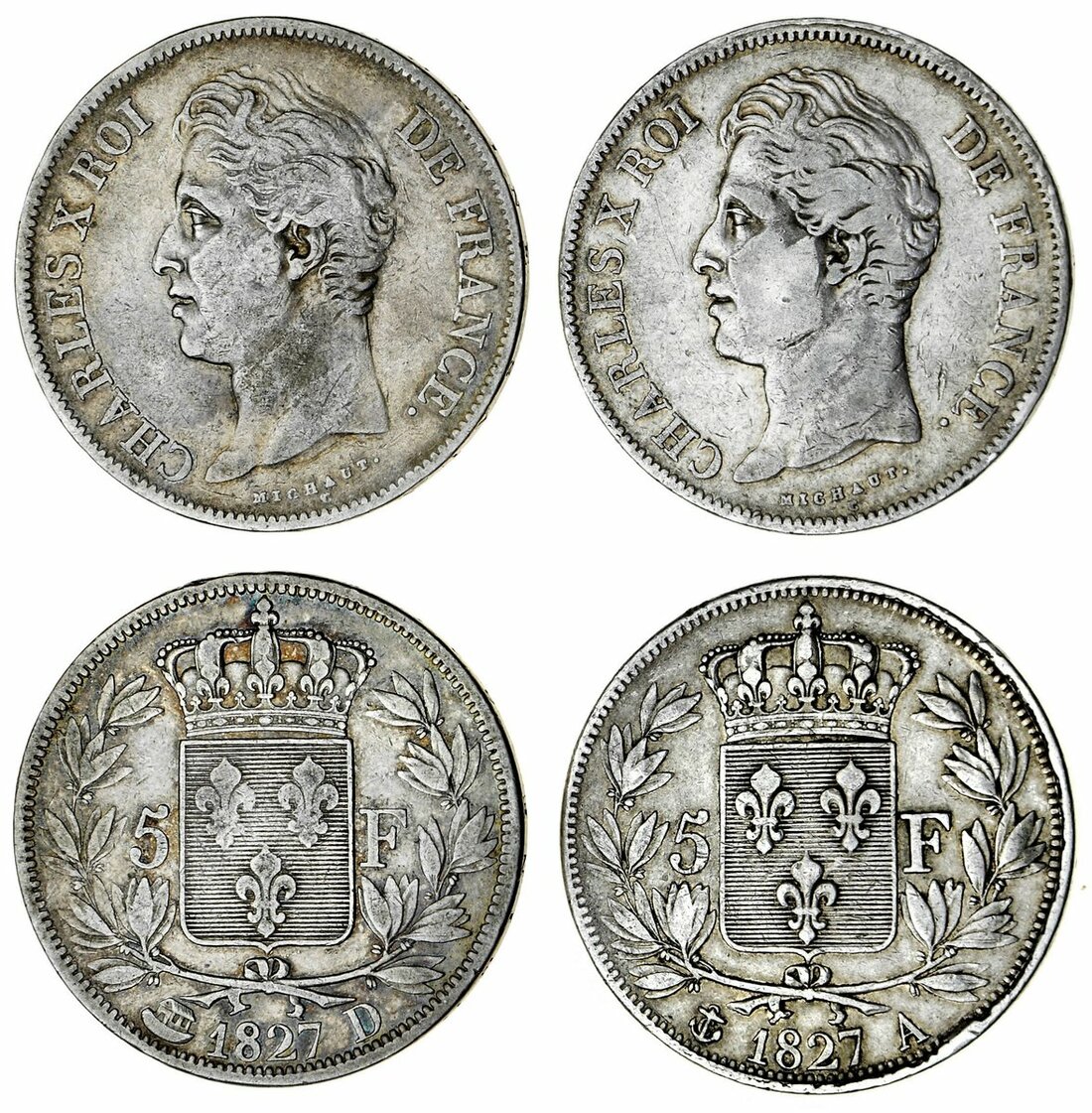 France, Restored Kingdom, Charles X (1824-30), 5-Francs, 2e type, Paris {anchor} {2}, 1827-A; another, 1829-A; also, Lyon {arc}, 1827-D (Le Franc 311.1, 4; Gad. 644; KM 728.1, 4), generally fine, the second better but harshly cleaned, and in PCGS details holder, graded F-Detail (3)