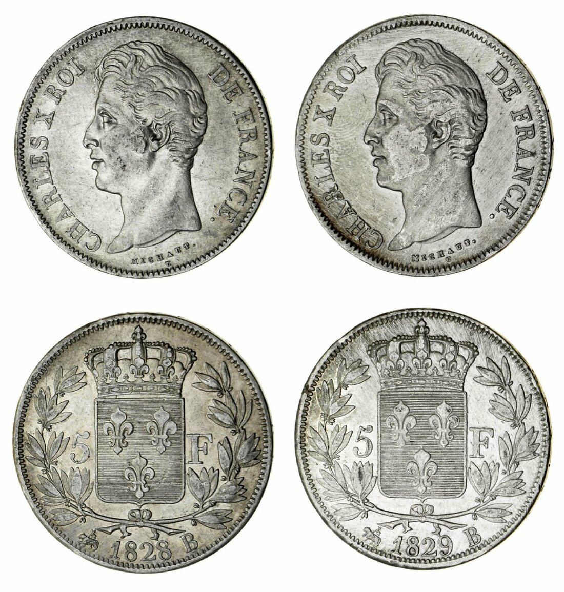 France, Restored Kingdom, Charles X (1824-30), 5-Francs, 2e type, Rouen {agnus dei} (2), 1828-B; another, 1829-B (Le Franc 311.15, 27; Gad 644; KM 728.2), both cleaned, otherwise very fine (2)