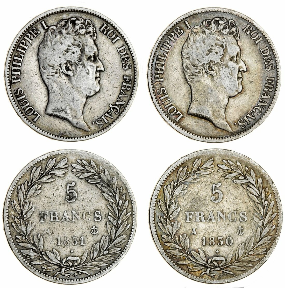 France, Restored Kingdom, Louis-Philippe I (1830-48), 5-Francs, Paris [A] {anchor}, 1e type, with regnal number, raised edge lettering (2), 1830-A; 1831-A (Le Franc 316.1, 2; Gad 676a; KM 736.1), fine or near so, both scarce (2)