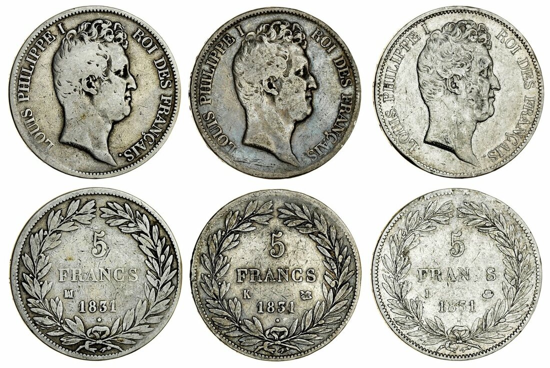 France, Restored Kingdom, Louis-Philippe I (1830-48), 5-Francs, 1e type, incuse edge lettering (3), Lyon {arc}, 1831-D; another, Bordeaux {leaf}, 1831-K; lastly, Marseille {palm tree}, 1831-MA (Le Franc 315.17, 20, 24/25; Gad 676; KM 735.4, 7, 10), mostly cleaned, fair to fine (3)
