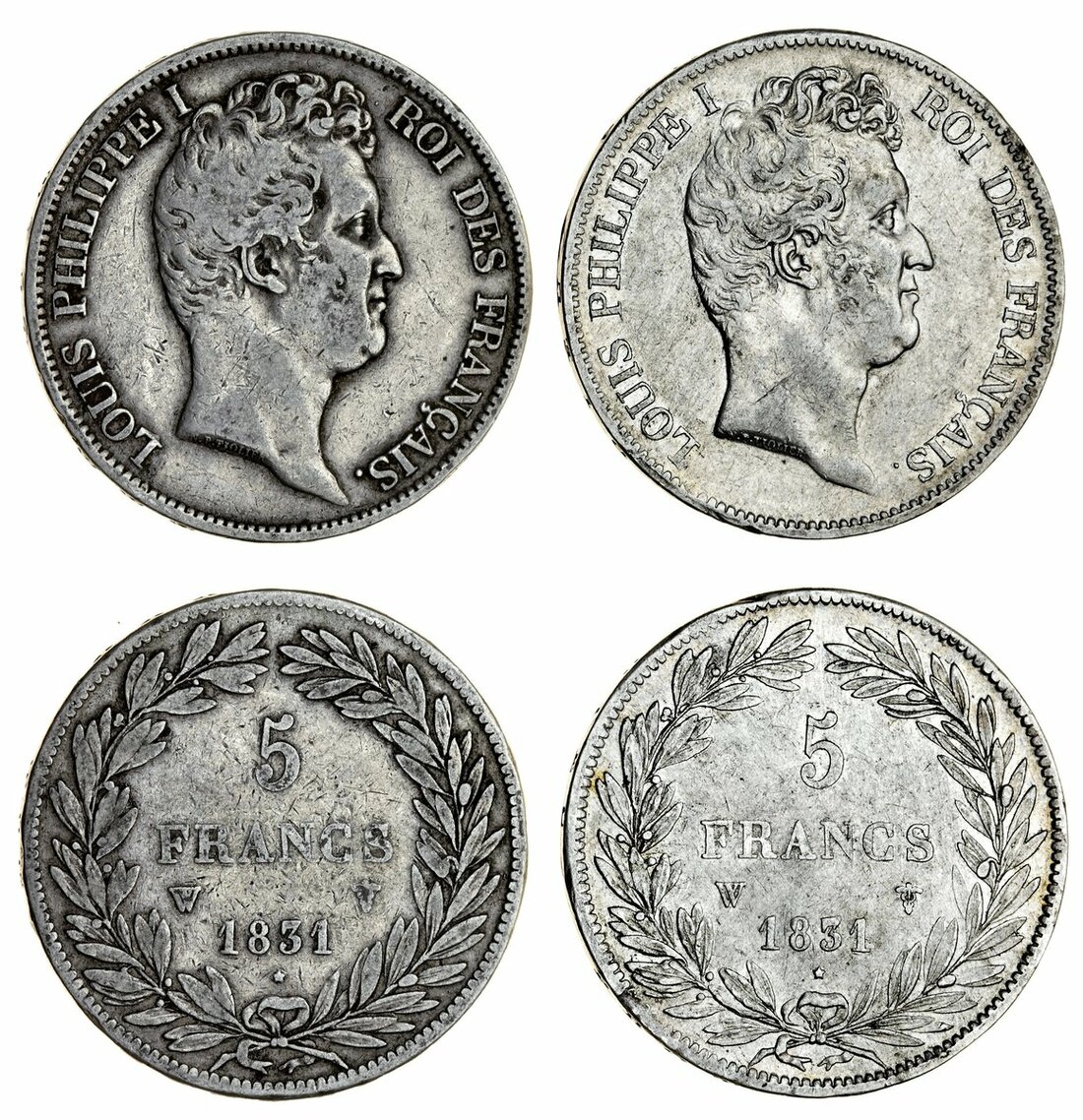 France, Restored Kingdom, Louis-Philippe I (1830-48), 5-Francs, 1831-W, 1e type, incuse edge lettering, Lille [W] {winged caduceus} (2); another, raised edge lettering (Le Franc 315.28; Gad 676; KM 735.13), the second harshly cleaned, otherwise very fine, the second fine (2)