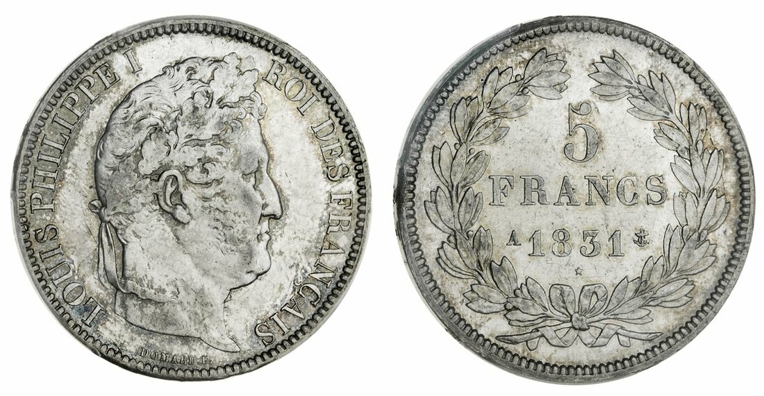 France, Restored Kingdom, Louis-Philippe I (1830-48), 5-Francs, 1831-A, Paris, laureate head (Le Franc 320; KM 745.1), light tone overlying lustrous surfaces, in PCGS holder, graded MS62