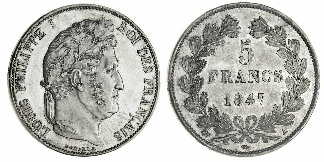 France, Restored Kingdom, Louis-Philippe I (1830-48), 5-Francs, 1847-A, Paris (Le Franc 325; Maz. 978; Gad 678a; Dav. 91; KM 749.1), in PCGS holder, graded MS61PL