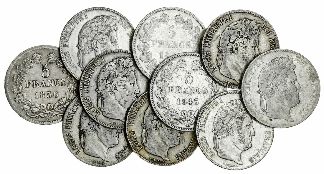France, Restored Kingdom, Louis-Philippe I (1830-48), 5-Francs, Rouen [B], 2e type (10), 1833-B; 1834-B; 1835-B; 1836-B; 1837-B; 1838-B; 1839-B; 1840-B; 1841-B; 1842-B; 1843-B (Le Franc 324; Gad 678A; KM 749.2), most cleaned, some harshly so, otherwise fine to near extremely fine, the 1840 the former but the scarce date in series, the 1839 in PCGS details holder, graded Scratch-AU (11)