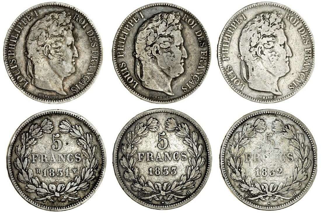 France, Restored Kingdom, Louis-Philippe I (1830-48), 5-Francs, La Rochelle [H] (3), transitional type, 1831-H; also, 2e type, 1832-H; 1833-H (Le Franc 324, 5, 18; KM 745, 749.5), the second once cleaned, otherwise all fine or near so, all scarce (3)