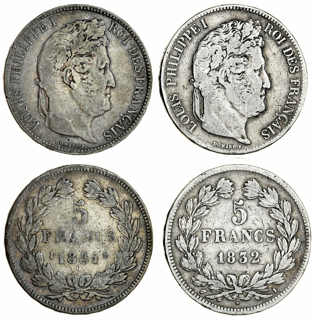 France, Restored Kingdom, Louis-Philippe I (1830-48), 5-Francs, Limoges [I] (2), transitional type, 1831-I; also, 2e type, 1832-I (Le Franc 324.6; KM 745, 749.6), the second once wiped, otherwise fine or near so, both rare (2)