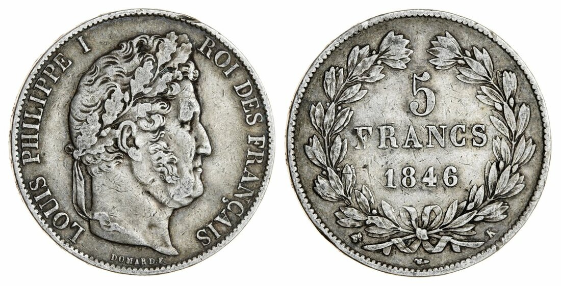 France, Restored Kingdom, Louis-Philippe I (1830-48), 5-Francs, 1846-K, Bordeaux, 2e type (Gad 678A; Dav. 91; KM 749.7), toned, a bold fine, a very scarce date in series