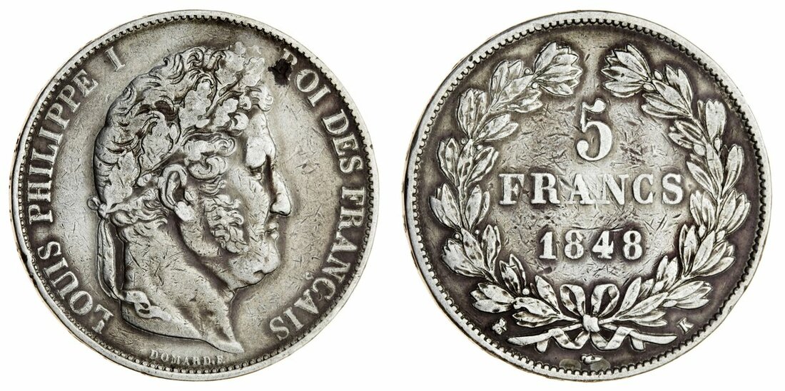 France, Restored Kingdom, Louis-Philippe I (1830-48), 5-Francs, 1848-K, Bordeaux, 2e type (Le Franc 325.19; Gad 678A; Dav. 91; KM 749.7), rubbed surfaces and with traces of tooling, otherwise a bold fine, very rare