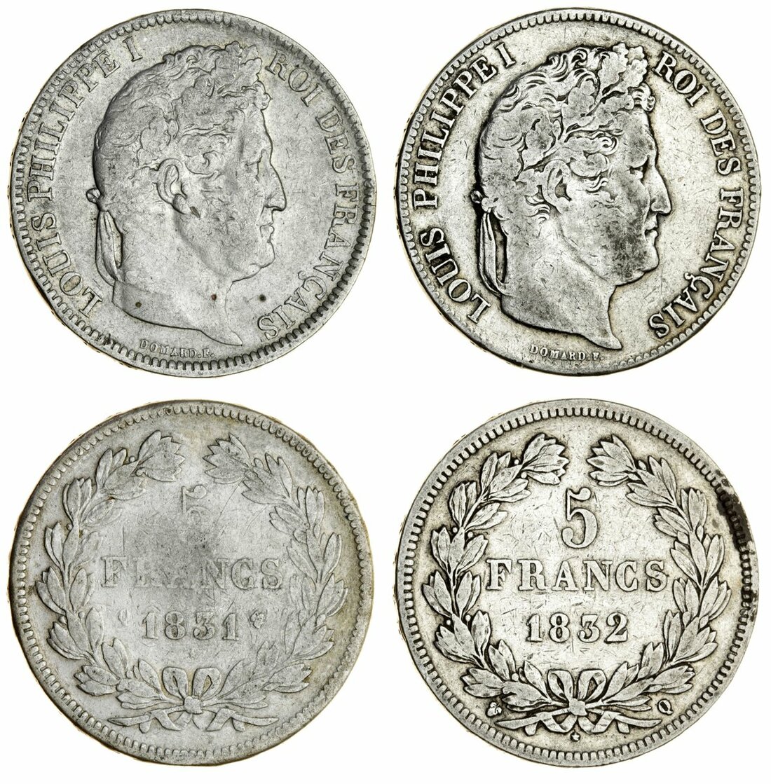 France, Restored Kingdom, Louis-Philippe I (1830-48), 5-Francs, Perpignan [Q] (2), transitional type, 1831-Q (Le Franc 320.13; Gad 677a); also, 2e type, 1832-Q (Le Franc 324.13; Gad 678A; Dav. 91; KM 749.10), both cleaned, otherwise fair to fine, both scarce (2)