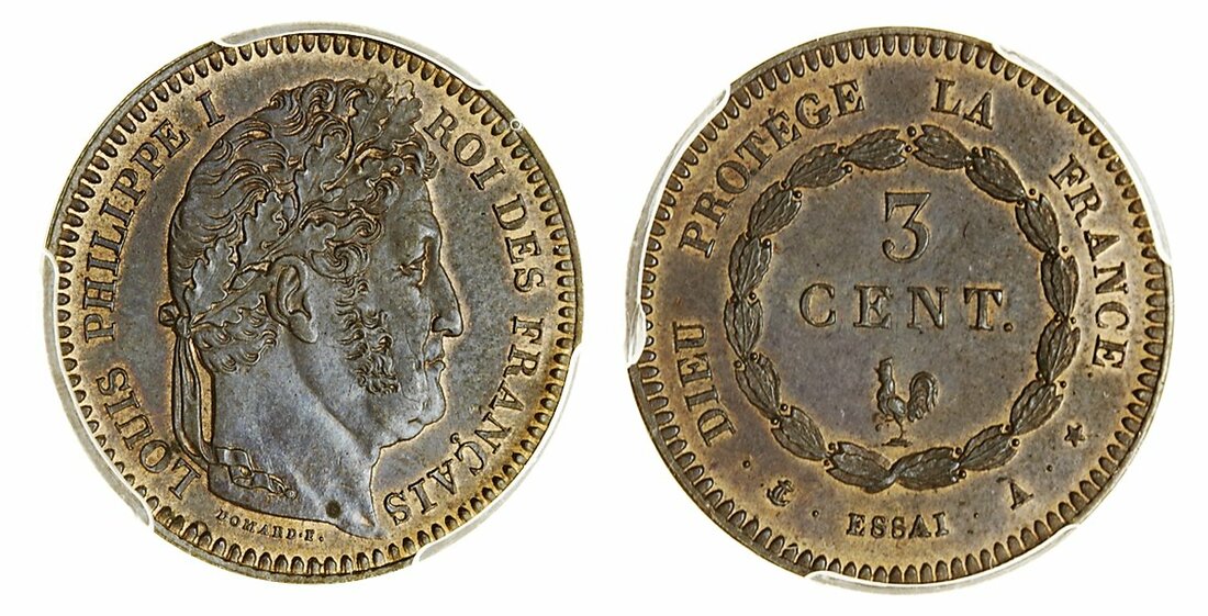 France, Restored Kingdom, Louis-Philippe I (1830-48), Pattern 3-Centimes, in copper, laureate head left, rev. value and cockerel within wreath (Maz 1097a; KM -), in PCGS holder graded SP63BN