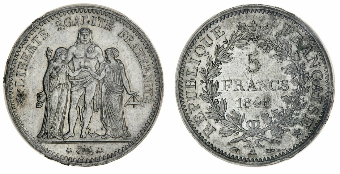 France, Second Republic (1848-52), 5-Francs, 'Hercules' type, 1848 (4), Paris, 1848-A [2]; another, Strasbourg, 1848-BB; lastly, Lyon, 1848-D (Le Franc 326; Gad 683; KM 756.1, 2, 3), the first lustrous, extremely fine but once wiped, the second toned, good very fine, the third stained, otherwise fine, the last fair to fine but scarce, the first in PCGS details holder, 'Spot Removed-AU Detail' (4)