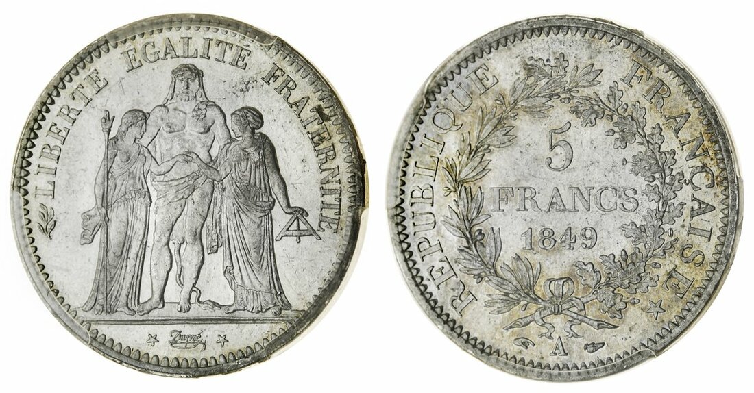 France, Second Republic (1848-52), 5-Francs, 1849-A, 'Hercules' type, Paris (Le Franc 327; Gad 683; Maz. 1180; Dav. 92; KM 756.13), cartwheel mint lustre, in PCGS holder, graded MS63