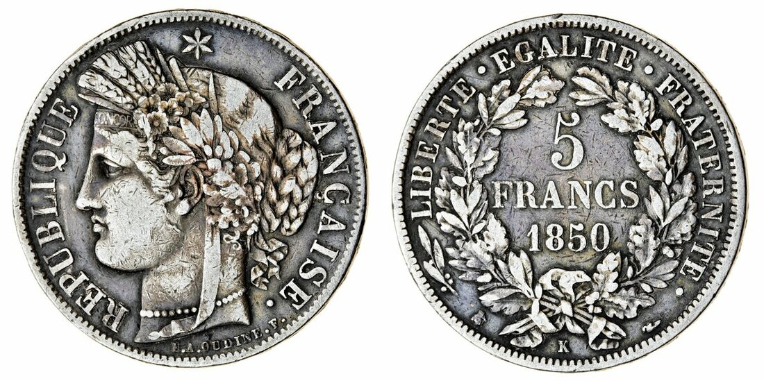 France, Second Republic (1848-52), 5-Francs, 1850-K, 'Ceres' type, Bordeaux (Le Franc 327.6; Gad 719; KM 761.3), once cleaned, otherwise fine, the key date for type, scarce thus