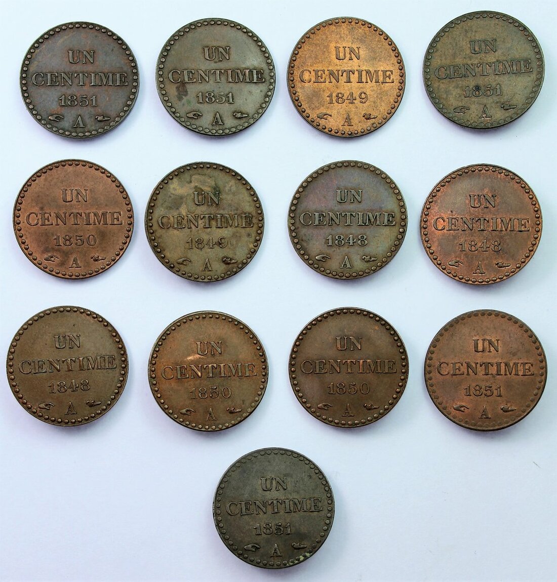 France, Second Republic (1848-52), Centimes, Paris [13], 1848-A [3]; 1849-A [2]; 1850-A [3]; 1851-A [5] (Le France 101; Gad 84; KM 754), very fine to almost uncirculated, some with much mint red (13)