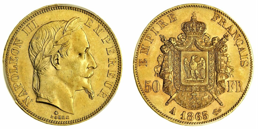 (g) France, Second Empire, Napoléon III (1852-70), gold 50-Francs, 1865-A, Paris (Le Franc 548; Gad 1112; KM 804.1), lustrous, rare with a reported mintage of only 3,740 pieces, in PCGS holder, graded AU58