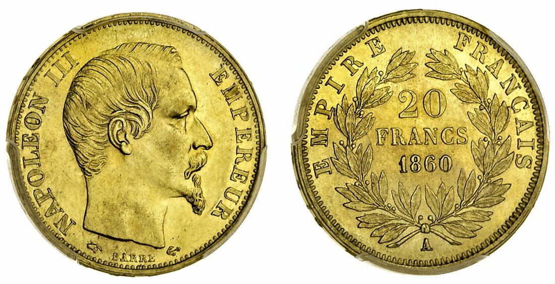 France, Second Empire, Napoléon III (1852-70), gold 20-Francs, 1860-A, Paris, bare head (Le Franc 531; Fb 573; Gad 1061; KM 787.1), in PCGS holder, graded MS62