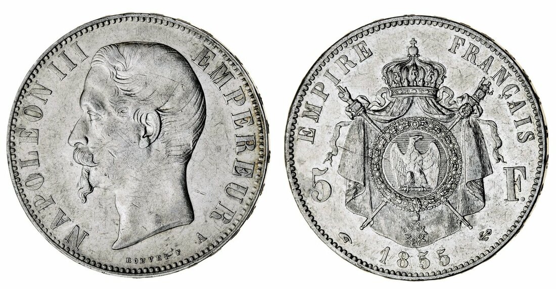 France, Second Empire, Napoléon III (1852-70), 5-Francs, 1855-A, Paris {hand-anchor} (Le Franc 330.3; Gad 734; KM 782.1), cleaned, otherwise a bold very fine