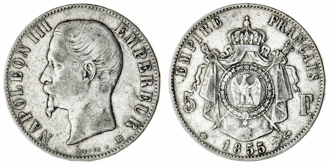 France, Second Empire, Napoléon III (1852-70), 5-Francs, 1855-BB Strasbourg {hand-anchor} (Le Franc 330.4; Gad 734; KM 782.2), lightly wiped, otherwise fair to fine, a scarcer type
