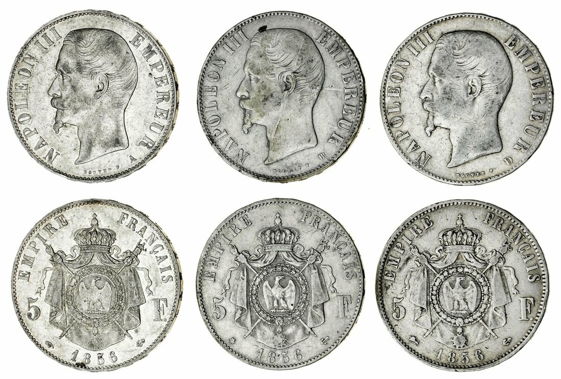 France, Second Empire, Napoléon III (1852-70), 5-Francs, 1856 (3), Paris, 1856-A, {hand-anchor}; also, Strasbourg {bee-anchor}; lastly, Rouen, 1856-D {lion-anchor} (Le Franc 330.8-10; Gad 734; KM 782.1-3), all lightly cleaned, fine to very fine (3)