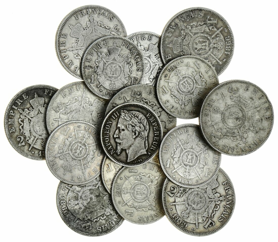 France, Second Empire, Napoléon III (1852-70), 2-Francs (8), Paris [5] 1866-70-A (KM 807.1); Strasbourg [2], 1866-BB; 1869-BB (KM 807.2); lastly, Bordeaux, 1866-K (KM 807.3), generally strictly fine, the 1870 once lightly cleaned, all scarce additionally, Francs (9), Paris [4] 1866-A; 1866-69-A (KM 806.1), generally good fine; Strasbourg [4]; 1866-BB, 1867-BB, 1868-BB; 1870-BB (KM 806.2), the last once wiped with a dry cloth, otherwise a bolder very fine, a scarcer date, the rest fine to good fine; lastly, Bordeaux, 1867-K (KM 806.3), cleaned, fine, scarce [17]