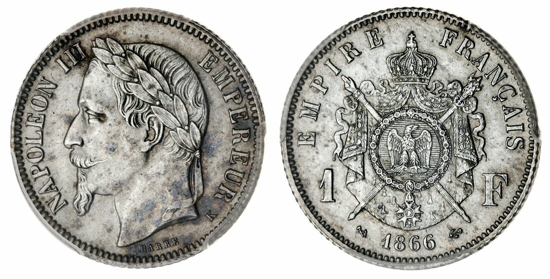 France, Second Empire, Napoléon III (1852-70), Franc, 1866-K, Bordeaux (Le Franc 215.3; Gad 463; KM 806.3), lustrous, good extremely fine, scarce thus, in early PCGS holder, graded AU58