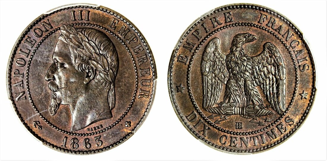 France, Second Empire, Napoléon III (1852-70), 10-Centimes, 1863-BB, Strasbourg (Gad 253), brown patina, otherwise good extremely fine, in early PCGS holder, graded MS62BN