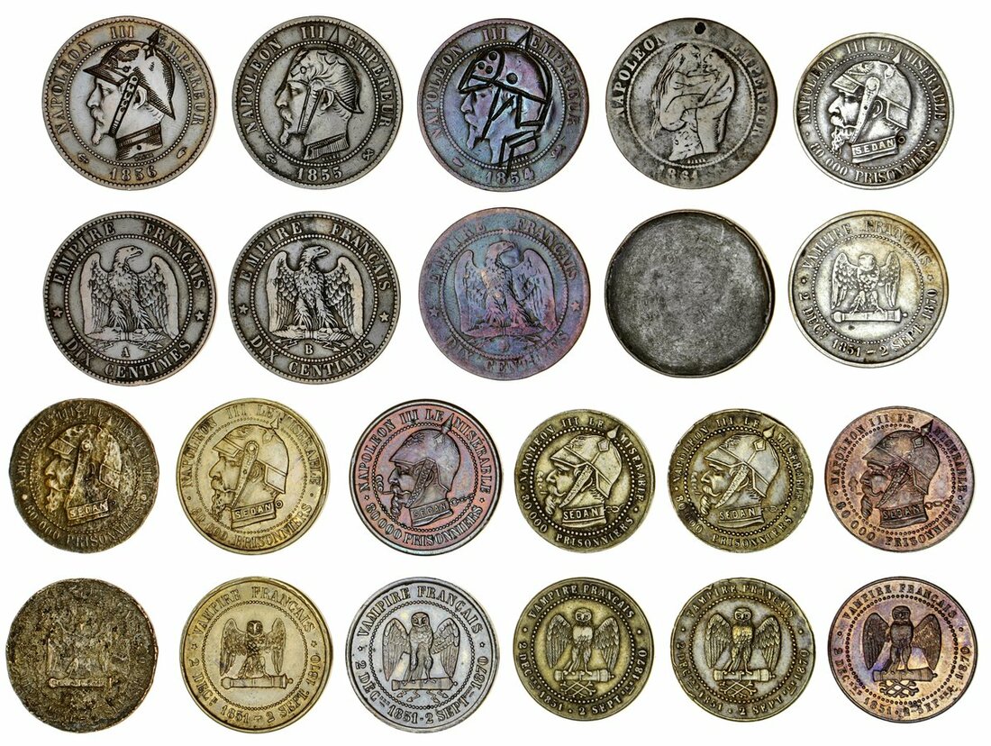 France, Second Empire, Napoléon III (1852-70), Satirical AE Tokens, Defeat at Sedan, 1870: 'Napoléon III, Le Miserable', rev. 'Vampire Francais ~ 80,000 Prisoners', in various metals [7], also engraved coinage (4), 10-Centimes, three engraved with a helmet in a similar style to satirical pieces, another crudely engraved in a pornographic style, plainly reflecting the feeling of the French populus about their Emperor following the Prussian defeat! fine and better, all interesting historical curiosities (11)