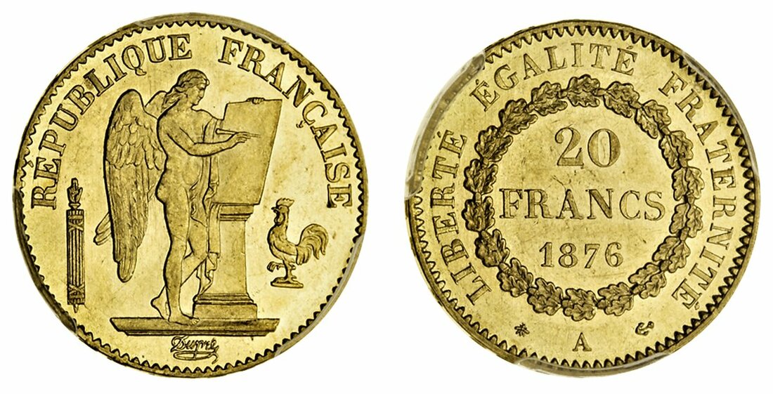 (g) France, Third Republic (1870-1940), gold 20-Francs, 1876-A, Paris (Le Franc 533; Gad 1063; Fb 592; KM 825), lustrous, in PCGS holder, graded MS64