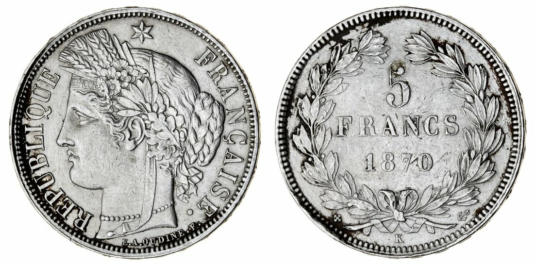 France, Third Republic (1870-1940), 5-Francs, 1870-K, Bordeaux {cross-crosslet-anchor} (Le Franc 332.2; Gad 742; KM 818.2), harshly cleaned, otherwise very fine