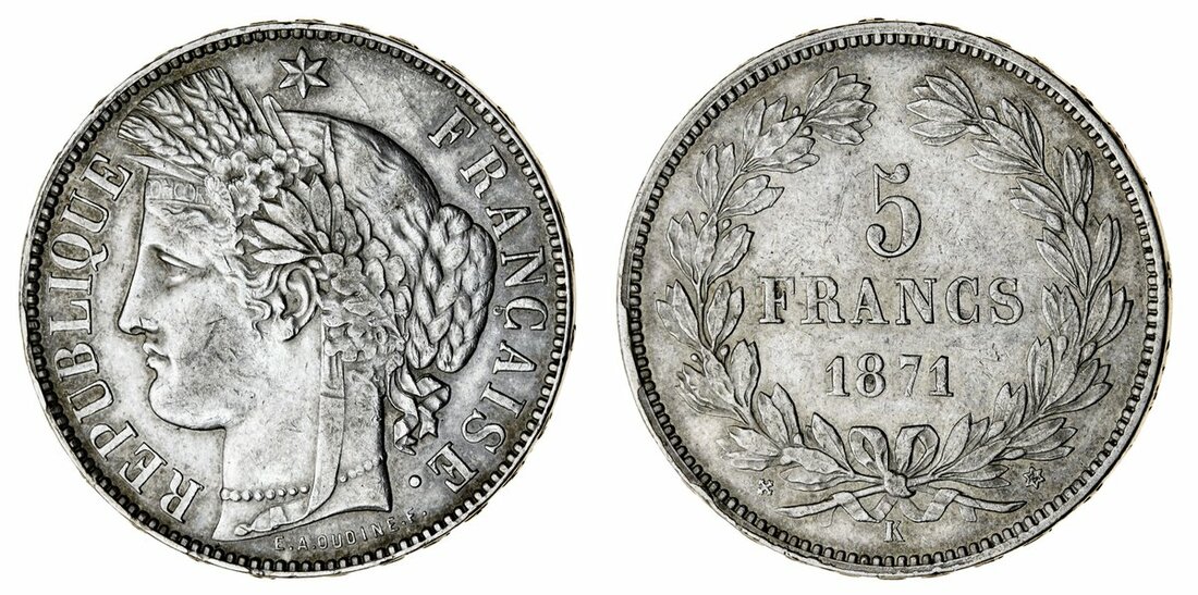 France, Third Republic (1870-1940), 5-Francs, 1871-K, Bordeaux {cross-crosslet-star}, étoile à 2h (Le Franc 332.8; Gad. 742; KM 818.2), wiped, otherwise very fine