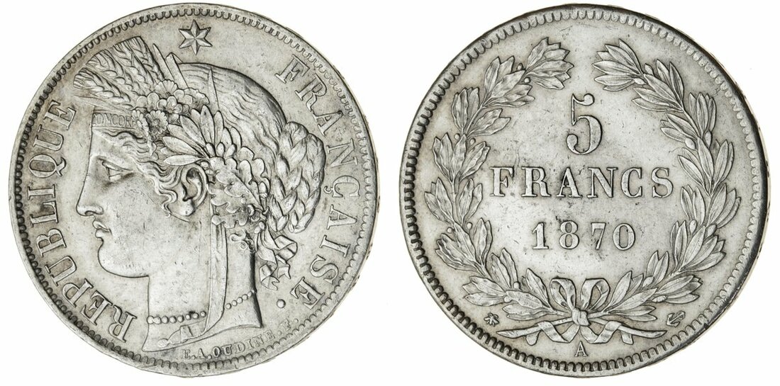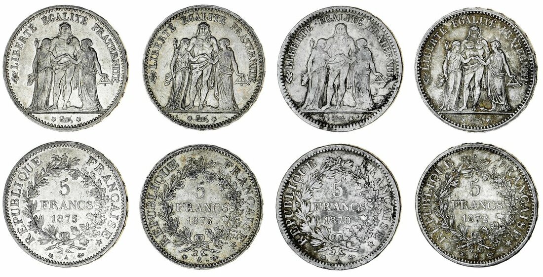 France, Third Republic (1870-1940), 5-Francs, "Hercules" type, Paris [A], {bee-anchor} (4), 1870-A [2]; 1872-A, with stars; 1875-A (2) (Le Franc 334; Gad 744; KM 820.1), the first, second and fourth once cleaned, the rest toned, generally very fine or better (5)