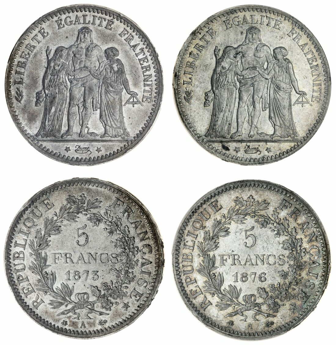 France, Third Republic (1870-1940), 5-Francs, "Hercules" types, Paris (2) 1873-A; another, 1876-A (Gad 745a), both in PCGS holders, the first graded MS62, the second MS63 (2)