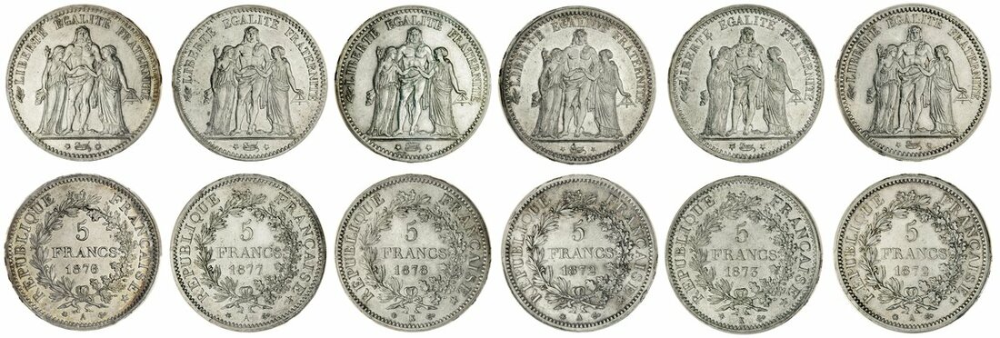 France, Third Republic (1870-1940), 5-Francs, "Hercules" types (6), Paris {4} 1872-A; 1876-A; 1877-A; and Bordeaux {2} 1873-K, 1878-K, Hercules standing facing between Liberty and Equality, rev. value and date within wreath (Gad 745a), the first with "spot removed", the rest cleaned, some harshly, all in PCGS details holders, graded AU or UNC (6)
