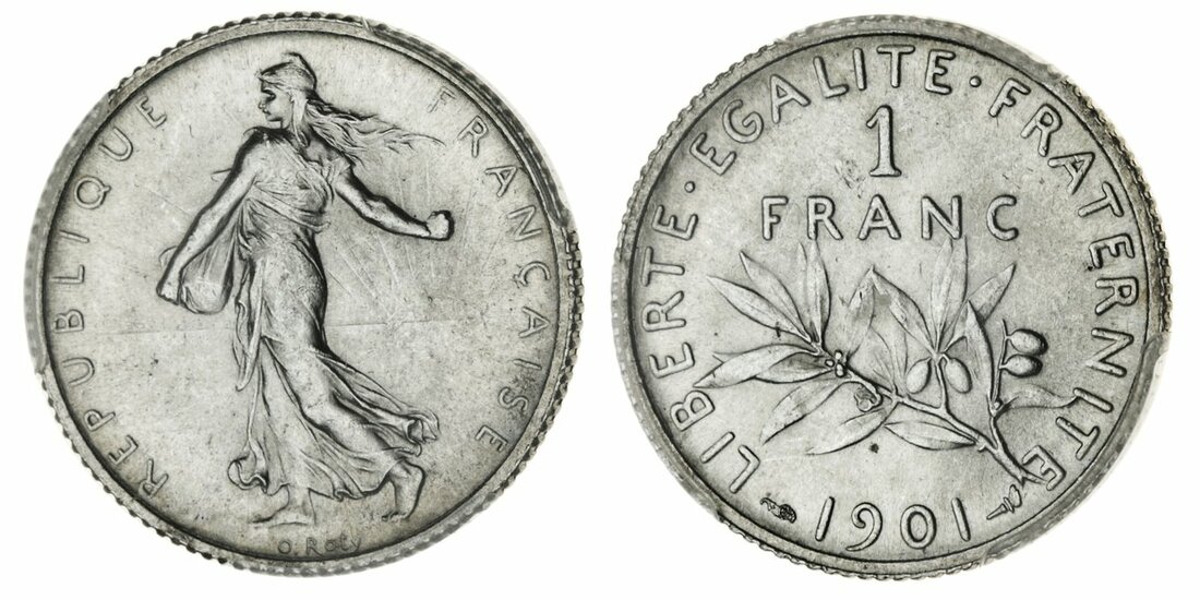 France, Third Republic (1870-1940), Franc, 1901 (Le Franc 217.6; Gad 467; KM 844.1), practically mint state, rare thus, in early PCGS holder, graded MS63